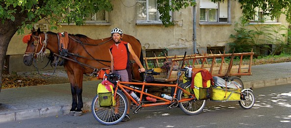 Voilà, 8000 km comme ça juste sur le pont pour prendre le traversier et nous rendre en Bulgarie pour les prochaines semaines. Pas de problèmes majeurs. On a bien tordu l’attache du Bob, mais on a redressé sans trop de peine. Nous sommes lourd, sûrement trop, avec l’ordi et tout. On traîne pas mal de nourriture aussi et beaucoup d’eau ( 5 à 7 litres ). Nous voilà donc en Bulgarie à Vidin pour une journée de repos à l’hôtel avec air climatisé, connexion internet s.v.p. !
