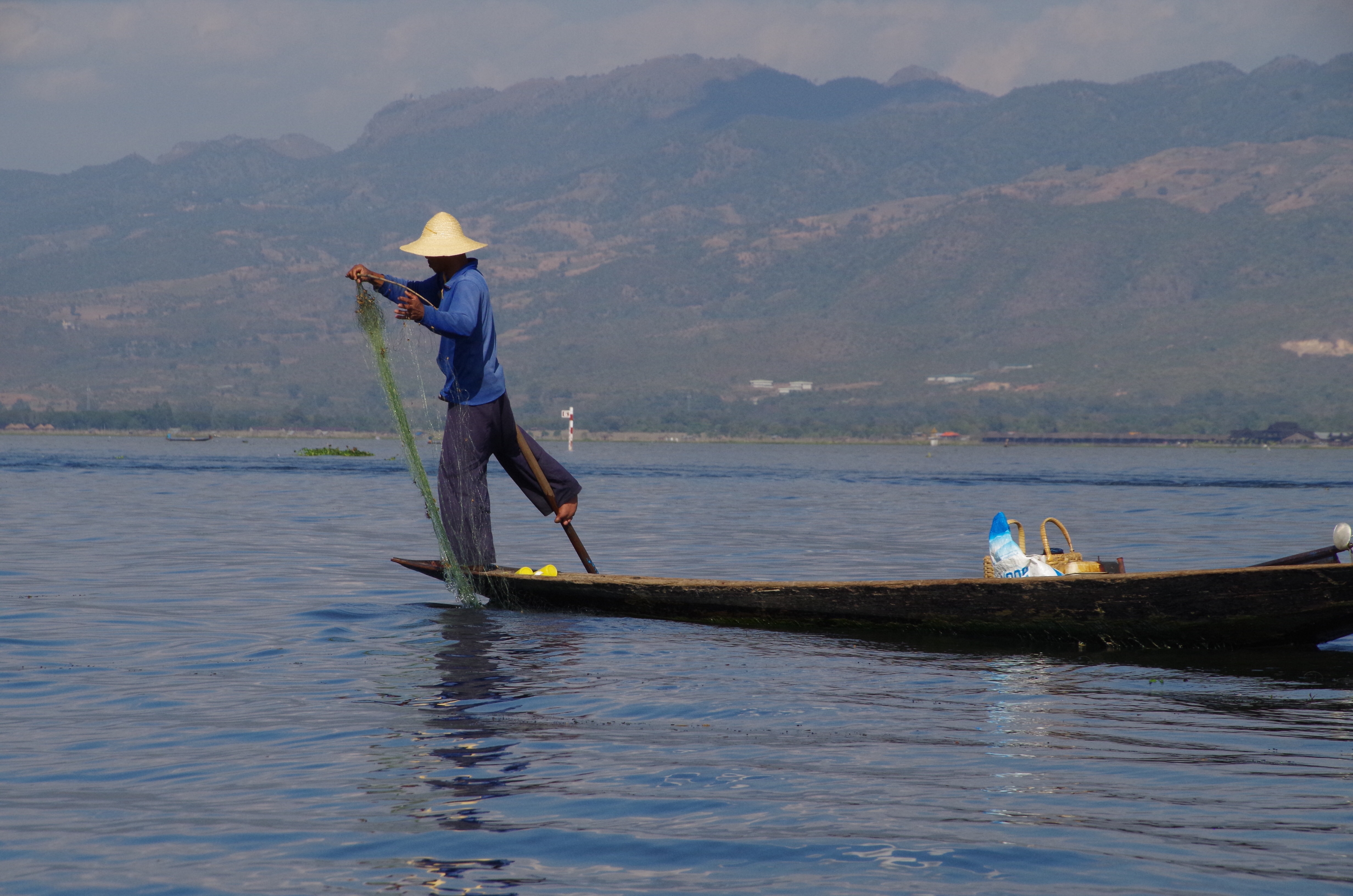 Journée de bateau sur le lac Inle avec les jardins flottants, monastères, stupas, pêcheurs et le marché qui change de village à chaque jour. Les communautés vont y vendre leurs produits. Ici une Pao.