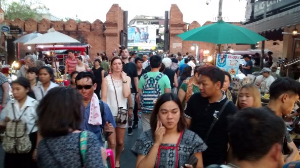 Le village typique du Nord des années passées c’est transformé en ville touristique avec autant de Thaïlandais que de touristes et d’expatriés. Plusieurs expats retraités y passent l’hiver au chaud et au calme. Cours de Yoga, de cuisine, de Thaï font parti du journalier. Sans compter les tatouages, les bunggies etc… Plusieurs y travail à distance comme traducteurs ou en centres téléphoniques, des pigistes de toutes sortes qui profitent d’une bonne connection internet. Des jeunes qui y flânent plus longtemps que prévue. La vie y est facile… et pas trop cher. Des millions de touristes surtout Chinois, Taïwanais, Malaisien et Français y passent pour quelques jours. Le » night market » , les excursions de toutes sortes, les cafés, les restos, les boutiques, le monde qui attire le monde. Si les jupes des écolières descendent au genoux, la short de la blanche se porte elle au plus court possible. Les blancs marchent ou louent des motos. Les Thaï ne marchent pas point. Il y a par contre un début d’engouement pour le vélo de route. Ils roulent en fin de journée quand le soleil faiblit et la température descend sous les 38′ avec cuissards, leggings longs, coupe vent, foulard et masques contre la pollution !