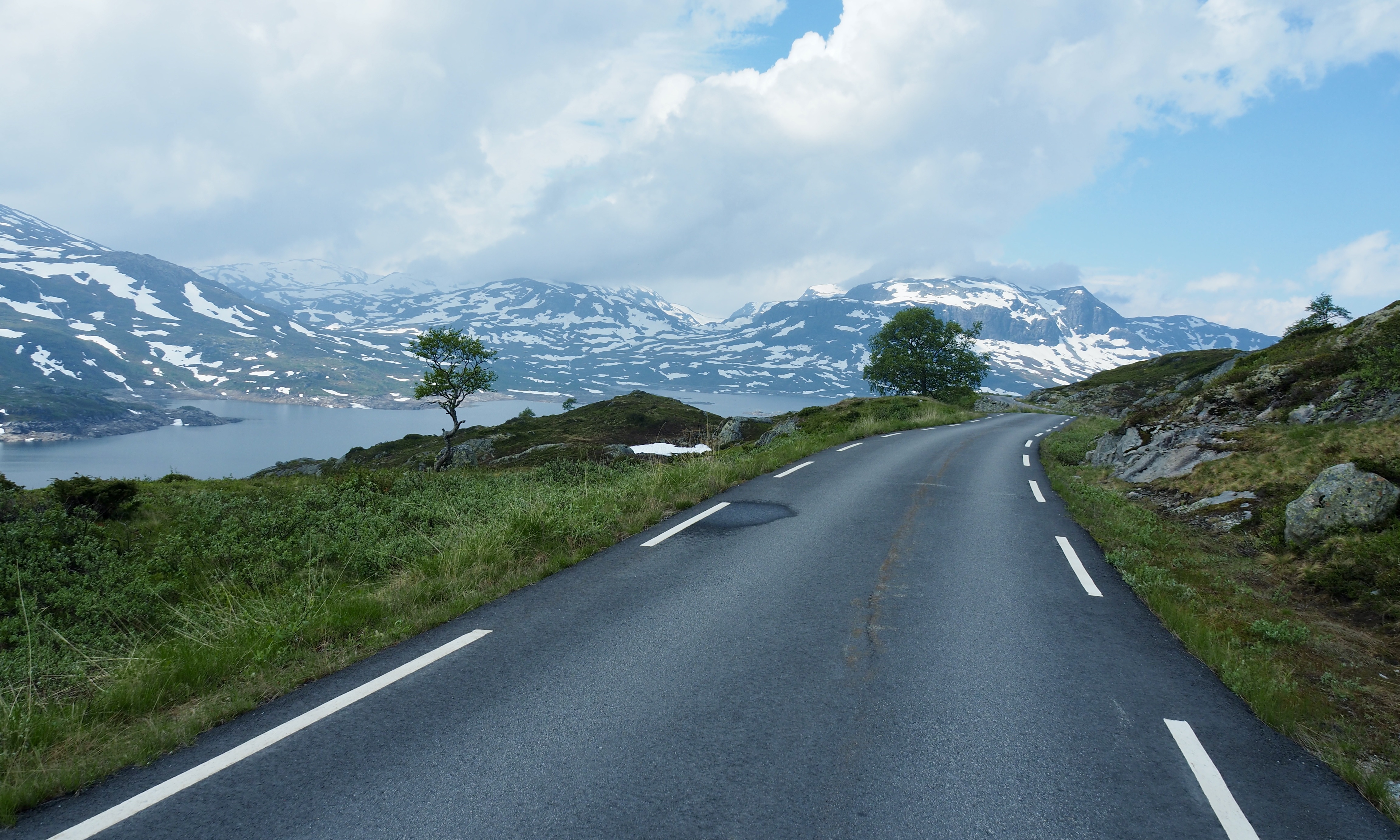 Le long du lac Leisjordvatnet sur la 3328 fut particulièrement beau puis arriva le 24 juin. Ce fut la fête si on veut ! Sans le savoir d’avance nous devons monter 24 km avec … 744 mètres de dénivelé positif et la journée se finira avec 74 km et 1343m de D+.