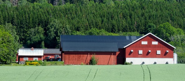 Belle maison de ferme Norvégienne typique avec le grenier à grain souvent transformé en maisonnette.