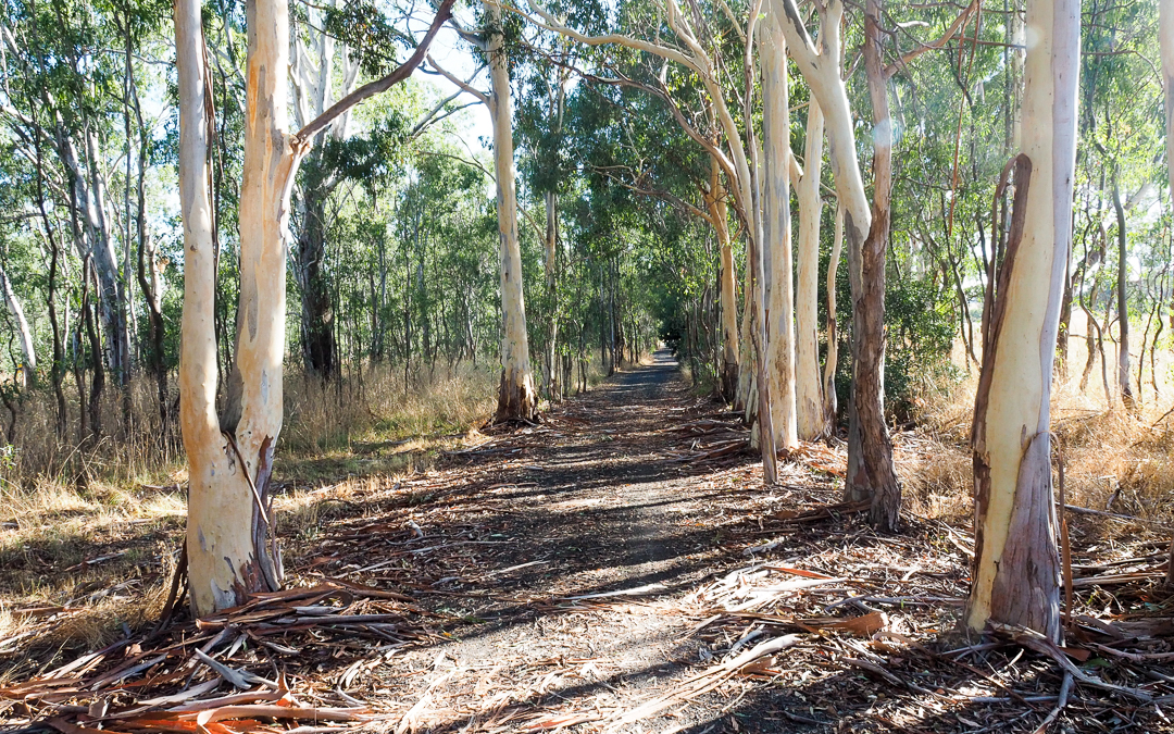 La trail au travers des eucalyptus qui perdent leur écorce.
