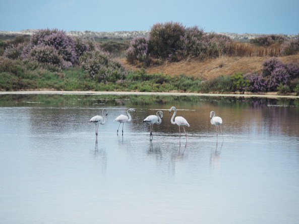 En petite barque nous traverse en Espagne en quelques minutes le temps de traverser la rivière Guadiana qui sert de frontière d’avec le Portugal. Nous croiserons quelques flamands roses le long de quelques salars en roulant sur les pistes de l’Eurovélo 1. En quittant la piste devenue en sable instable nous croisons de nombreux tunnels ( serres) où poussent les fraises et les framboises. Au camping nous échangeons avec un autre cycliste Sud Africain et Tom, un jeune Québécois. Nous nous croiserons encore deux fois avant que nos routes divergent.