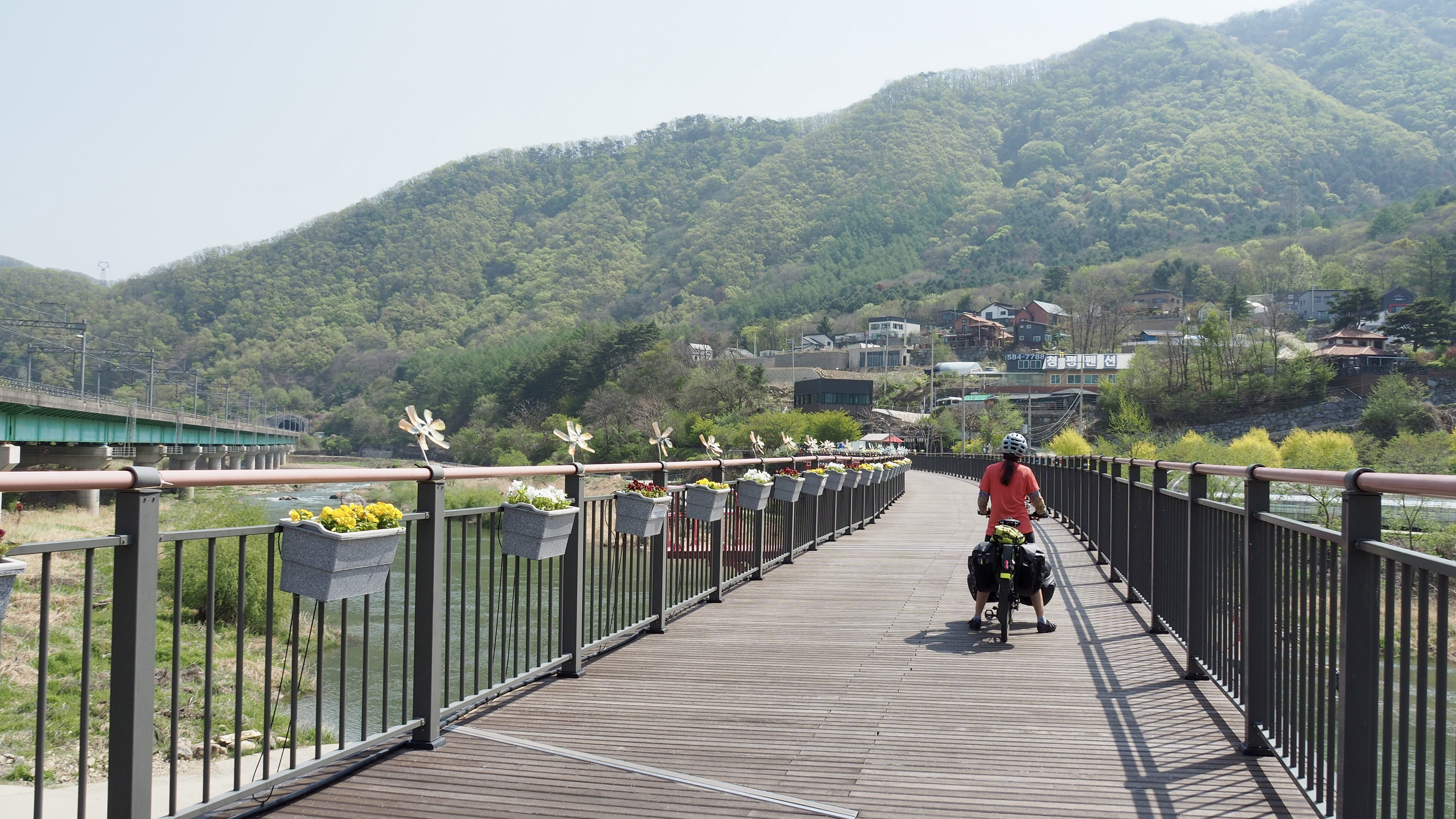 C’est ainsi que nous reprenons la route pour faire la section Bukhangang path, une piste magnifique parfois le long de la route, sur une ancienne voie ferrée, une digue ou sur une passerelle, une section touristique qui nous rappelle un peu Les Laurentides qui nous mène à Chuncheon.