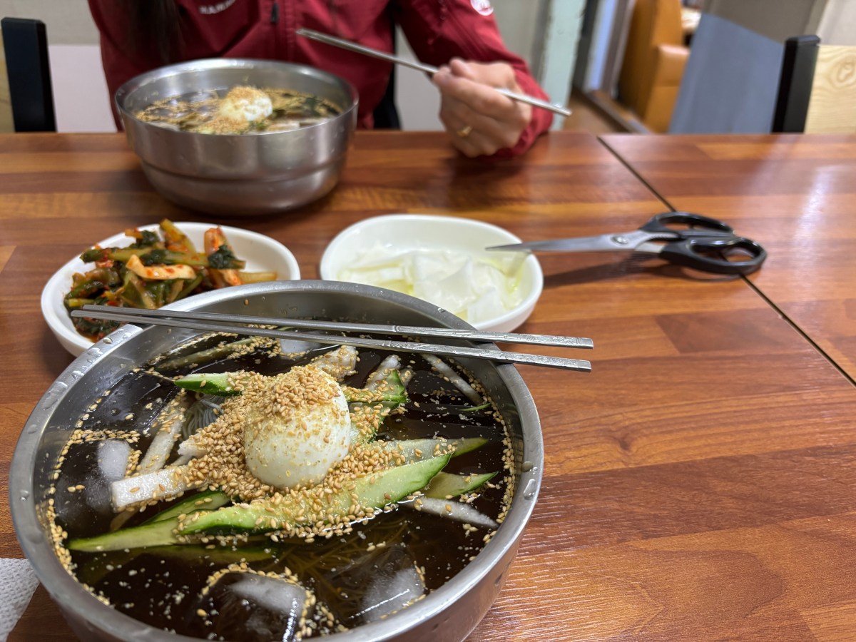 On essaye toutes sortes de mets. Ici une soupe froide.