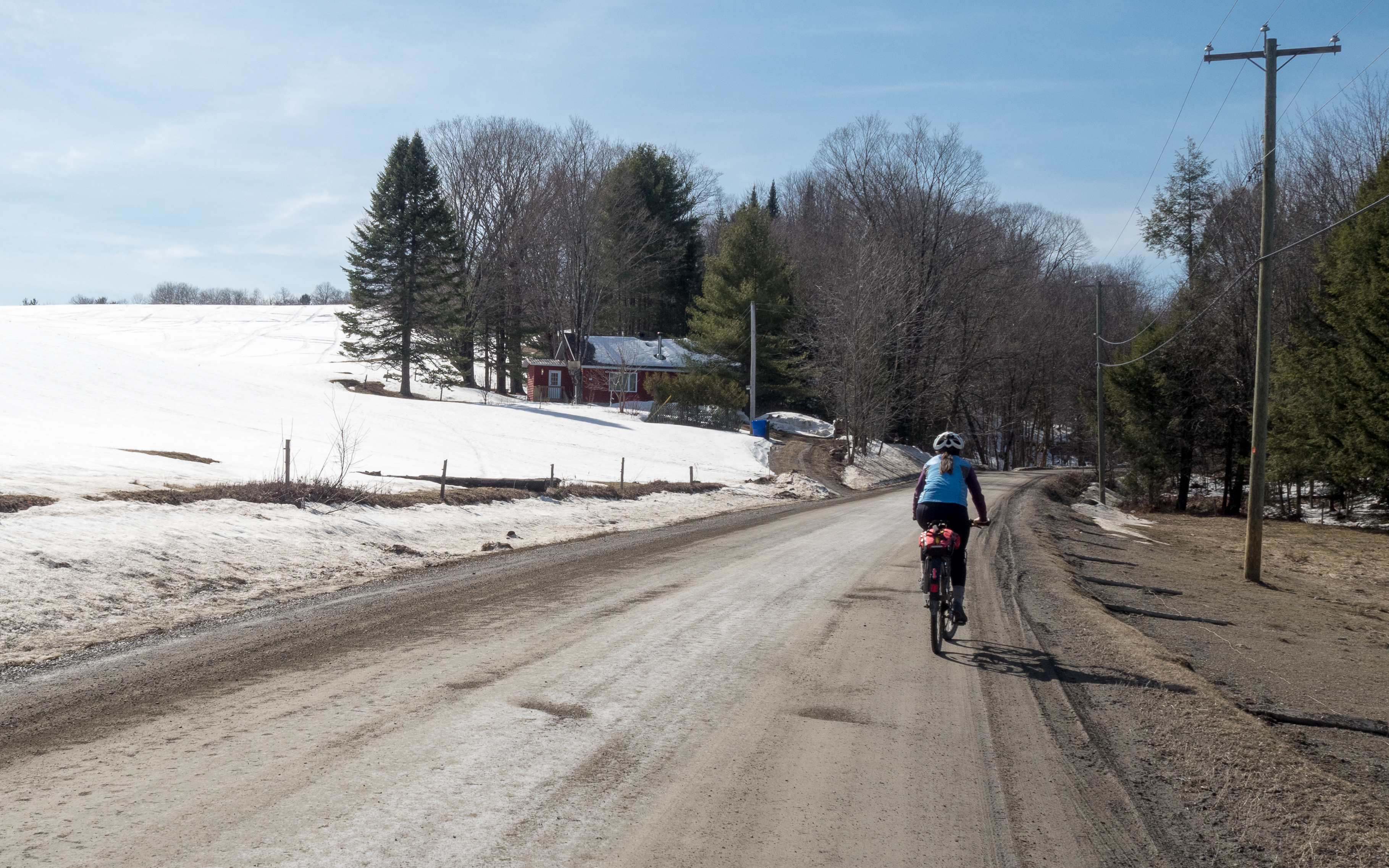 Une semaine plus tard les vieux remettent ça avec la plus jeune. Emma 6 ans et pas toute ses dents. Cette fois le tandem est trop grand pour ses petites jambes alors nous utiliserons le « follow me » attaché à mon vélo. Le parcours aussi va changer. Nous partons de chez elle à St-Pie pour nous rendre au mont Orford. C’est moins long mais il y a pas mal plus de côtes la deuxième journée.