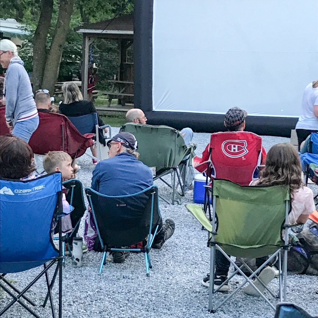 Au camping, après une petite baignade dans la piscine nous mangeons ensemble avant d’aller voir le match du Canadien sur grand écran extérieur svp, merci et avec des bonnes chips. Il faut dire que le grand père et le petit fils s’accordent bien pour les chips.