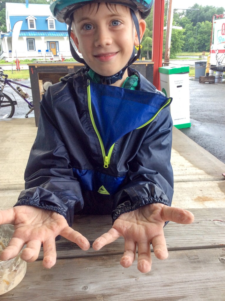 Nous partons encore de Drummondville pour nous rendre chez elle à St-Pie. La première journée nous empruntons la piste cyclable la Campagnarde mais cette fois nous camperons à Roxton Falls au camping de l’île. Un « mont blanc » juste avant d’arriver au camping revigore notre petite Alice.
