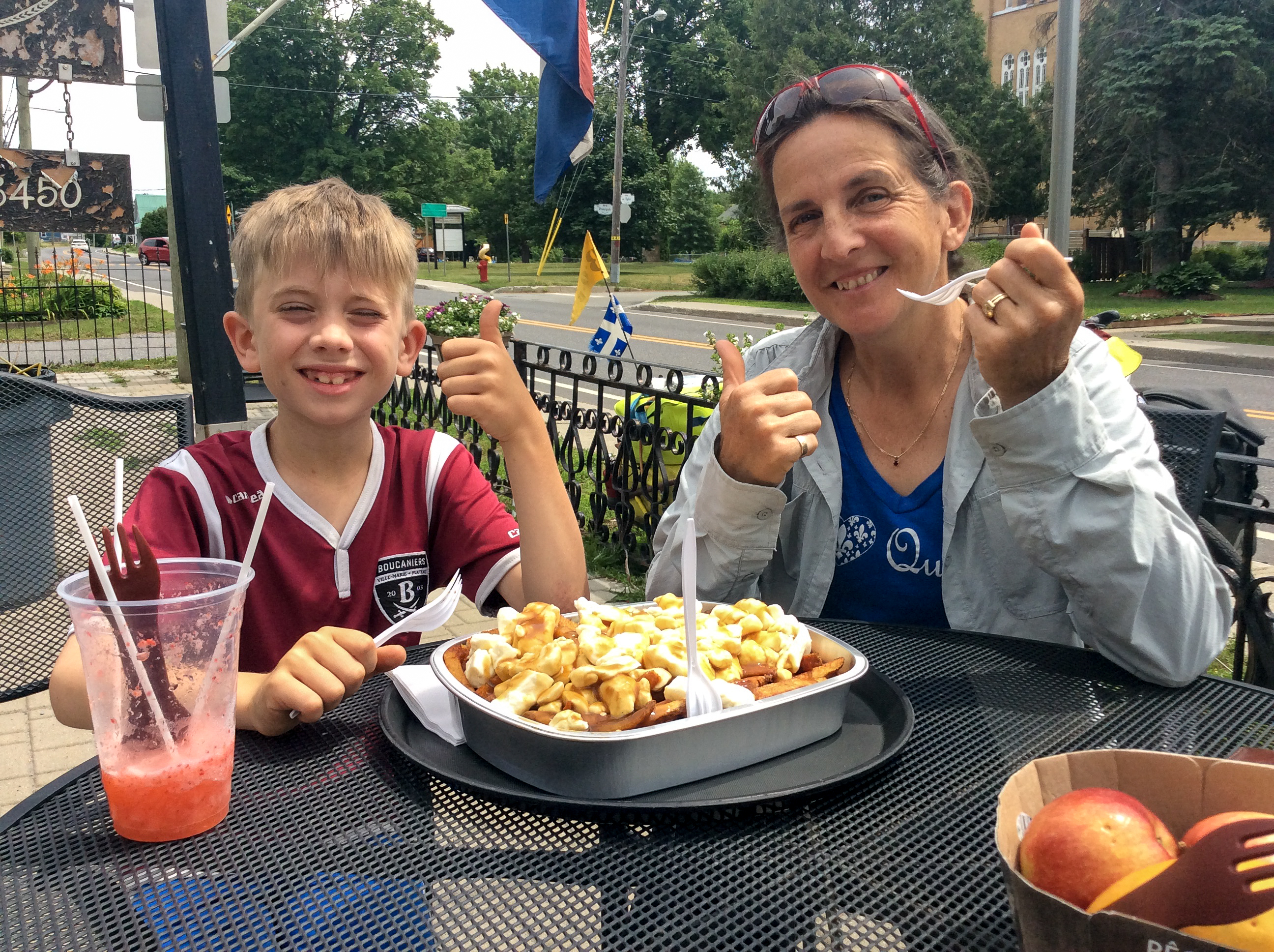 Nous passerons quand même la nuit sous la tente avant d’entreprendre la dernière journée qui nous mènera peut-être à bon port car il reste environ 80 Km ! Doute ! Au matin nous affrontons un super vent de face, comme si on en avait besoin ! Arrivée à Chambly par la piste cyclable « La route des champs » . IL fait chaud, très chaud et le vent nous caresse toujours le visage. Eva, la mère de Léopold s’inquiétant nous suggère de nous y rejoindre et d’apporter à Léo un cuissard de vélo tout neuf. Voilà qui nous aidera à faire un peu moins de pause « mal aux fesses ». De plus elle prendra dans l’auto une partie des bagages pour nous alléger. Remonté et bien décidé à nous rendre nous reprenons la route en faisant cette fois des pauses « Mister Freez ». Avant le pont de la Concorde nous devons attendre que les bateaux passent à l’écluse du pont Victoria sous un soleil de plomb. Rendu là, c’est Léo qui nous guide, il connait le chemin pour entrer chez lui. Bien fier de lui ! C’est pas rien, 207 Km en quatre jours. Une bonne limonade maison et des baggels au saumon nous ravigote car nous étions un peu cuit.