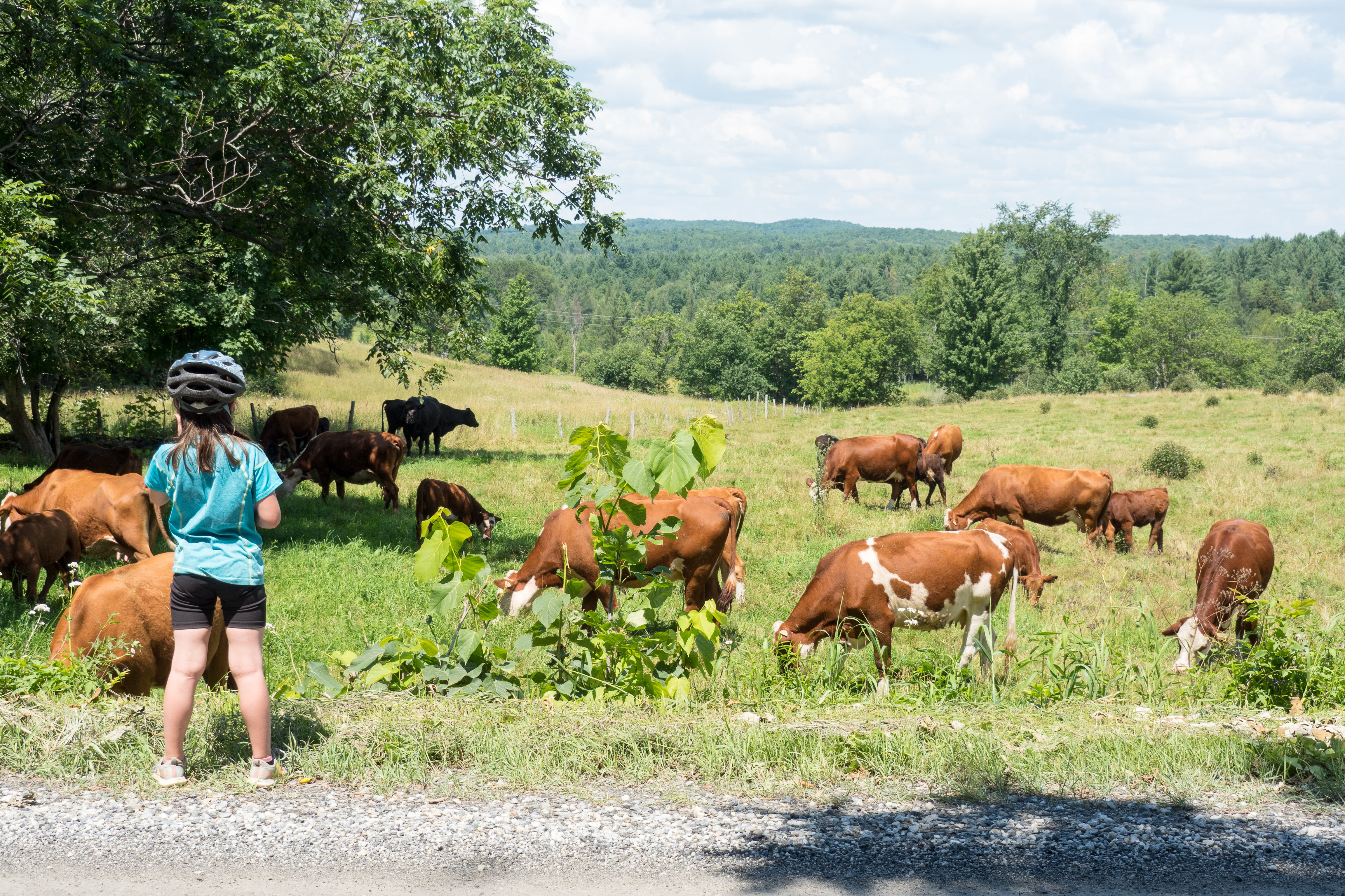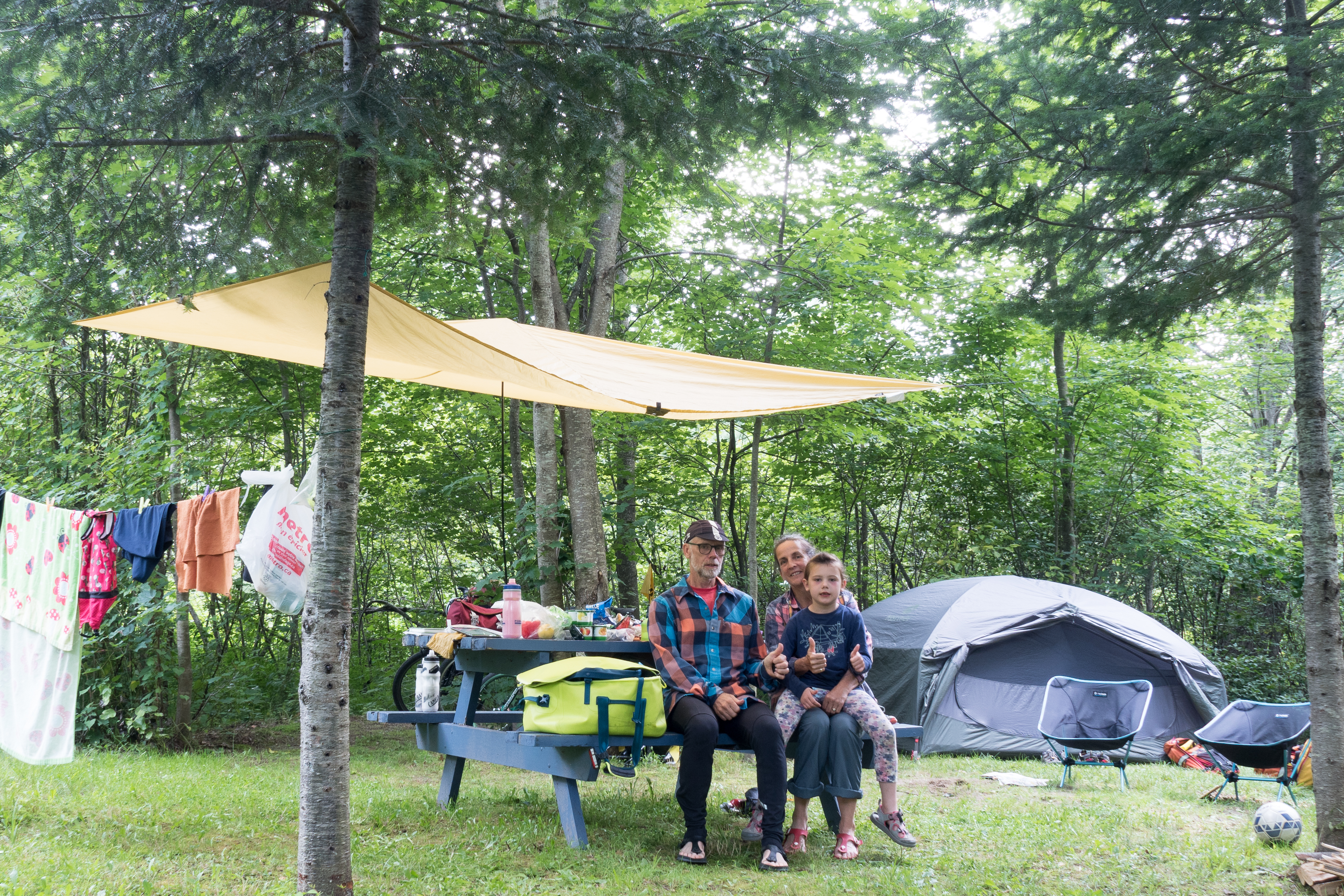 Le jour deux fut plus exigeant avec pas mal de dénivelé et de chemin de terre. Elle roulera seul les premiers 10 km pour sortir du parc puis elle sera de retour en tandem avec le Follow me. Si Emma m’aide dans les montées elle préfère quand même les belle descente à 50 km/h où elle cri de bonheur, wooooou ! Nous camperons au lac d’argent d’Eastman au camping Leroux qui est aussi Bienvenue cyclistes. Donc pas besoin de réservation. Le lac est vraiment rafraichissant en cette journée chaude de juillet. Comme Emma parle à tout le monde, les rencontres sont faciles. D’ailleurs notre voisin de camping qui devait se rendre au village nous rapportera un super pop cycle pour Emma et quelques bières pour finir la soirée et parler longuement de voyages tandis qu’Emma dormait pas mal tôt.