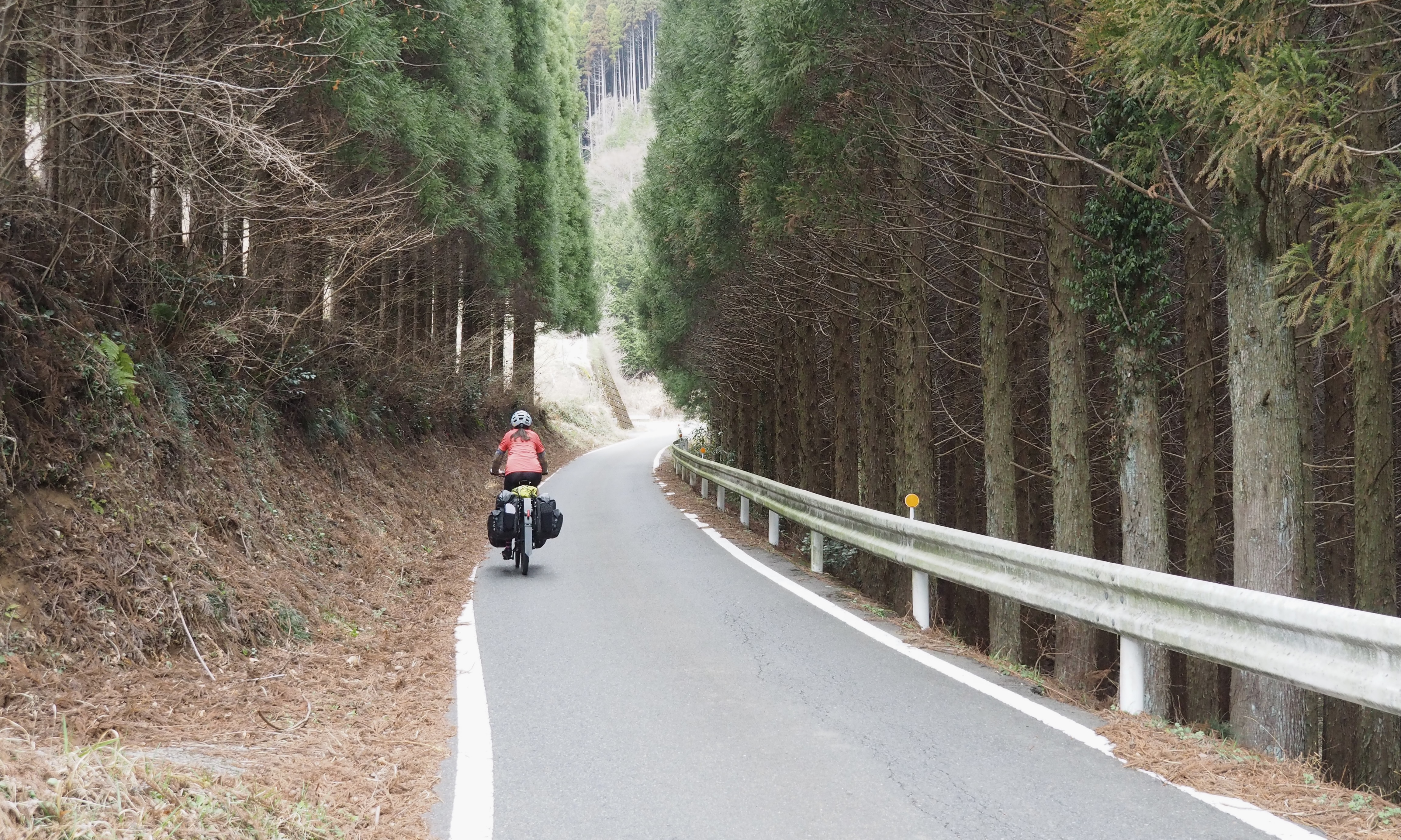 C’est bien beau tout ça mais faut tout de même remonter avec tout notre barda vers notre prochaine destination la région d’Oita en passant par la route 7, très petite route 7 et bien sûr sa vallée, un super belle après midi au rythme de tortue car ça monte tout l’aprem. Trouver un bivouac est compliqué tellement il n’y a pas de plat, nous finirons le long d’un caniveau dans un virage. Au réveil, le ciel est bien bouché, il va pleuvoir, nous déjeunons en vitesse et démontons le campement avant la pluie qui commencera dès nos premiers coup de pédale. 4,5 km de montée et 350 mètres de dénivelé positif en continue jusqu’au TUNNEL, nous sommes bien moites sous nos habits de pluies. Après le tunnel c’est la descente, 22 km de long et 1150 mètres de dénivelé négatif en pente plutôt raides. Cette route 7 est formidablement belle mais nous ne prenons des photos que dans notre tête.