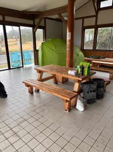 – Trouver un emplacement pour passer la nuit sans payer 100$. Ici ça se complique un peu. Des pluies abondantes s’annoncent et le vent s’invite. Le parc ciblé pour bivouaquer s’avère douteux mais le stationnement un kilomètre avant est assorti d’un bâtiment avec une grande salle et des toilettes. Comme d’habitude rien n’est fermé à clé. On s’installe à l’intérieur. Heureusement car avec les vents, je crois bien que la tente aurait succombé. Pendant la journée plusieurs passent aux toilettes pour les utiliser ou pour les laver à grande eau. Un monsieur viendra nous aviser de nettoyer avant de partir et surtout de prendre nos déchets avec nous. Comme quoi notre présence est bien connu et ne les dérange pas à condition qu’on garde nos déchets! À 17h. Une autre visite. Une jeune femme nous apporte café saucisses et des nikumans . Gratuit et faite de votre mieux qu’elle nous montre sur son cellulaire. Origato!