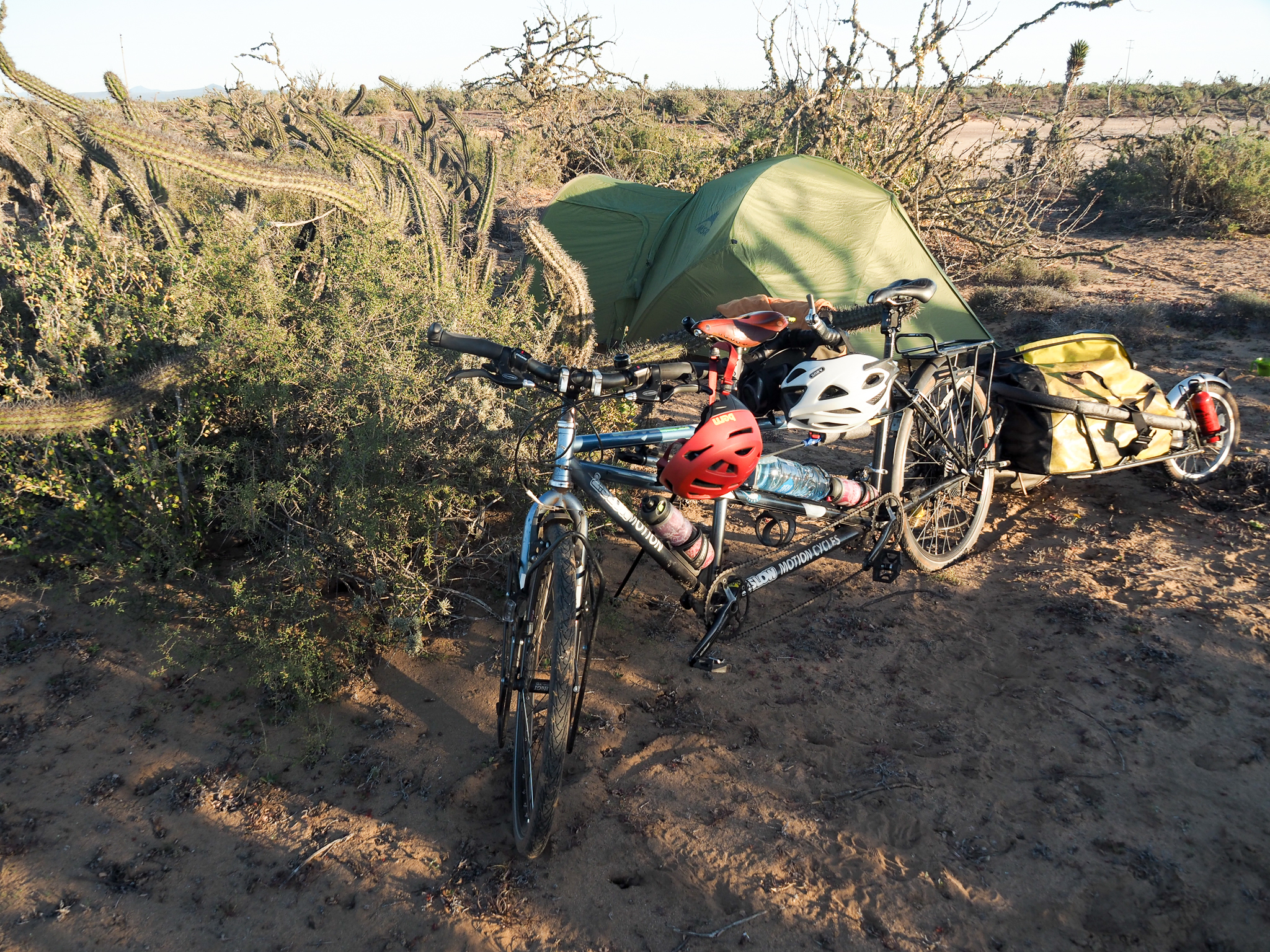 La tendance se maintien, nous rencontrons de plus en plus « d’expat » sur la route comme en camping. Baja est définitivement voué aux road-trip. Vélo, westfalia, campeur de toute sorte se partagent la route. À notre surprise, beaucoup d’Européens font transporter leur camion/campeur/4X4 de la mort par bateau. $$$ Le trajet pour eux devient, Halifax-Alaska-Ushuaia et on remet le tout sur le bateau. Les mini-maisons aussi sont de la partie. Trois nous suivent. Une mini-maison c’est comme une tortue. À Loreto ils sont réuni pour une télé-série! Hé ben! Pour les cyclistes c’est souvent une étape entre l’Alaska et Ushuaia. Les plus jeunes, cherches les places gratuites, d’autres, plus vieux et plus riches, les RV aménagés. Nous faisons un peu des deux. Coucher avec les cactus c’est bien mais une bonne douche aussi! Sur les plages, nous sommes tous là, cyclistes, gros RV, westfalia, mini-maison etc…
