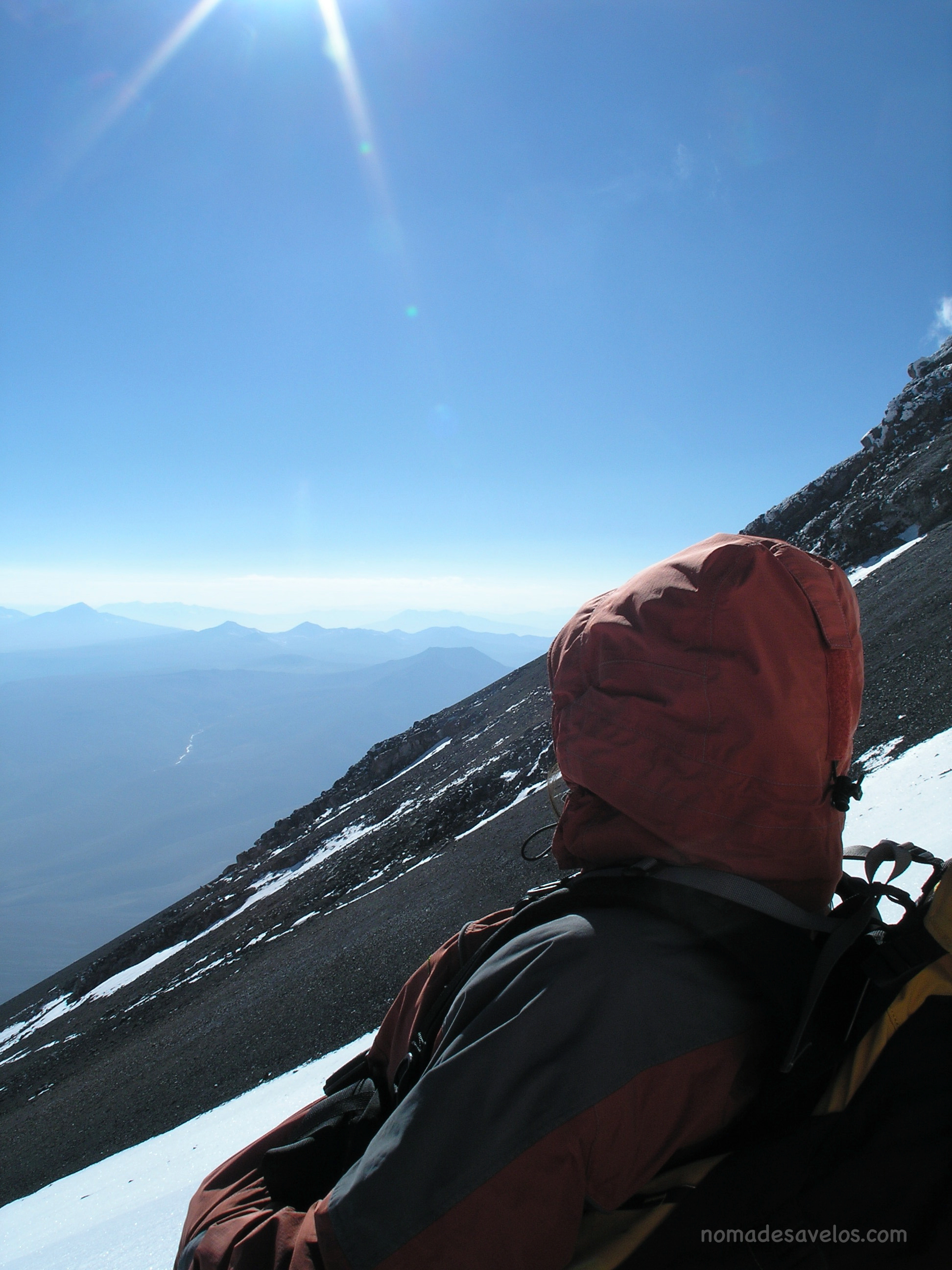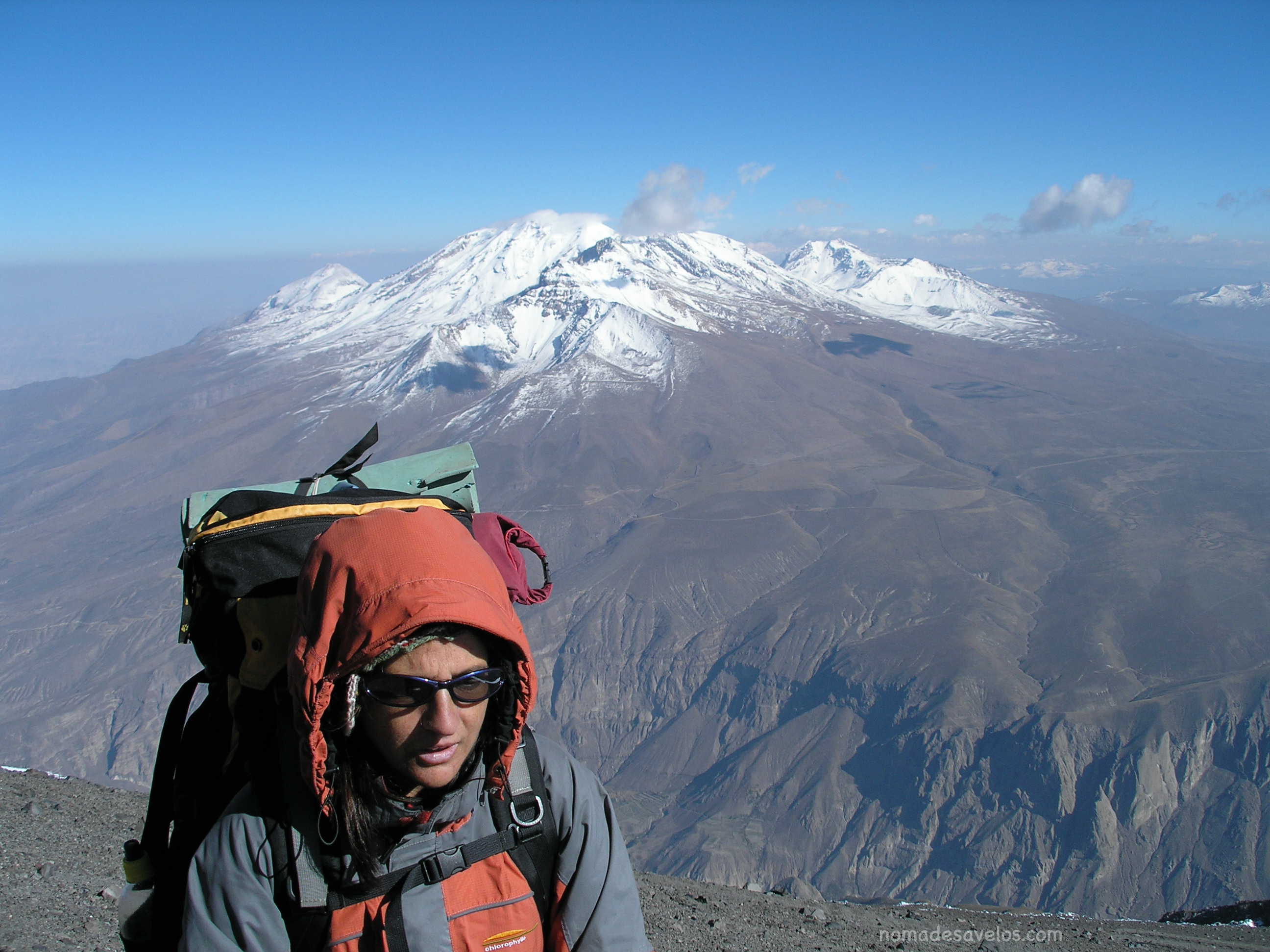 Nous poursuivons notre route jusqu’à Arequipa la ville blanche. De là nous trouverons un guide pour grimper le El Misti. Juste de regarder les 5822m enneigés nous avons des craintes. Finalement au matin du départ nous partons avec notre guide et un assistant pour monter le matériel pour le coucher à 4900m versant sud, moins utilisé. La monté est enivrante, le sol noir de la cendre de ce volcan rend nos pieds brulants mais dès que le soleil se couche le froid et le gel s’installent pour la nuit qui est là très tôt en fin d’après midi. Le temps de préparer le repas, nous enfilons tous nos vêtements. Rien ne retient la chaleur et tout se fige, nous partons dormir. Le lendemain levé à trois heures pour le sommet, qui sera ardu pour nous, notre corps n’est pas encore adapter. Nos pas sont lent et nous entendons notre cœur battre dans ce silence incroyable. Nous montons en zigzag tellement la pente enneigée est abrupte. Le sommet est vraiment la récompense avec une vision incroyable par un temps des plus clair. C’est pour nous une nouvelle découverte, l’Himalaya nous appelle déjà.