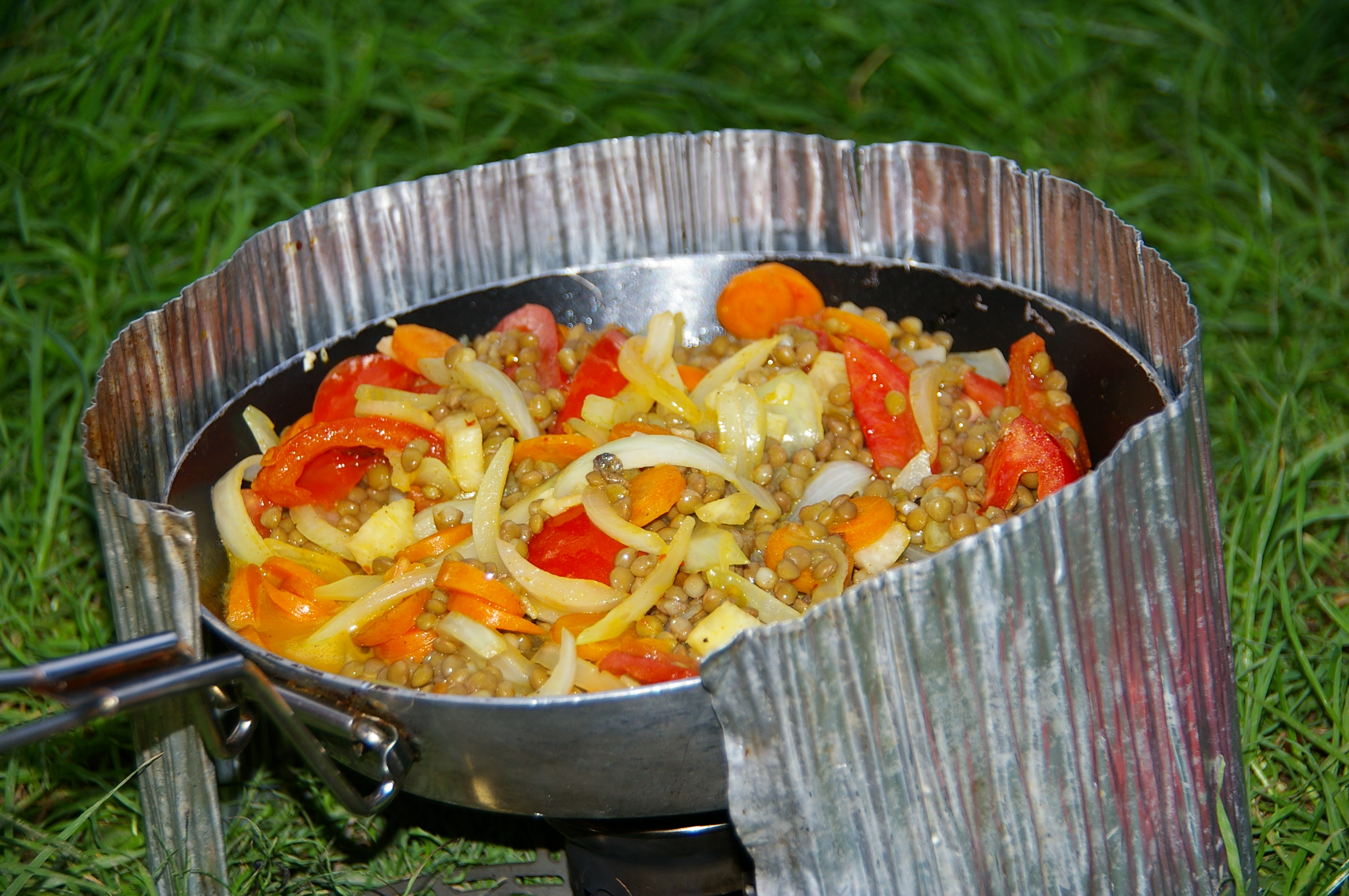 - Un poêlon de style wok avec un manche repliable, un chaudron Snow Peak en titane dans lequel le poêle se range. Gourdes de vélo, sac à eau de 5 litres, ustensiles, un couteau Suisse avec tire bouchon. Deux tasses. Bols et assiette pliables Orikaso.