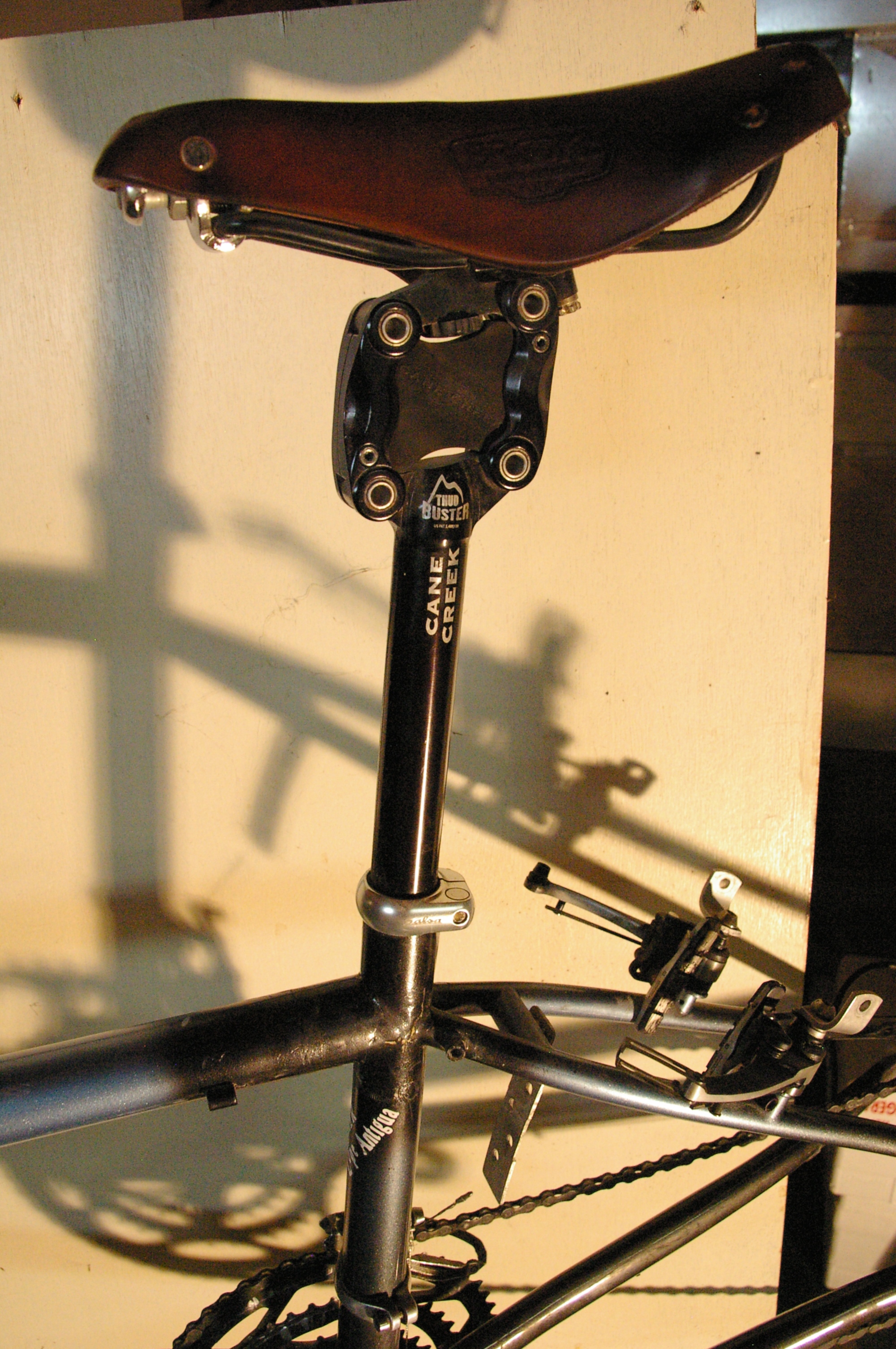 Un peu de peinture noire et un nouveau lettrage. Nous le surnommons maintenant le « 2 slow motion ». Le tandem est toujours équipé d’un drum brake et de freins V-brake. Les vitesses sont changé par des bar-end shifter comme sur les vélos de triathlon. Il est munit d’un dérailleur 9 vitesses shimano XT Shadow. Une cassette 11-34, des plateaux 52-39-30 étaient de mise jusqu’en 2017. Suite a de douloureuses montées en Thaïlande, j’ai changé le petit plateau de 30 dents pour un 24 dents, en espérant monter n’importe quel col ! A moins que ce ne soit notre âge et notre forme qui soit en cause ? Pour Josée, une tige de selle Cane Creek Thudbuster comme suspension. Un must, car elle ne voit pas venir les obstacles, et je n’ai pas toujours le temps de l’avertir du choc!